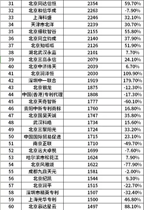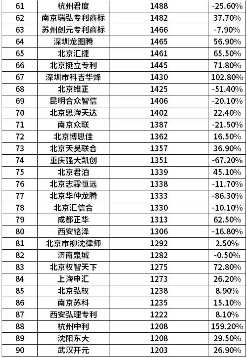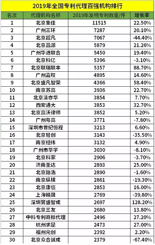 排行依據(jù):排行以2019年發(fā)明申請公開專利為依據(jù),對發(fā)明案件前一百代理機構(gòu)進(jìn)行排行。其中為保證增長率數(shù)據(jù)更具準(zhǔn)確性,選擇發(fā)明申請日在2018年且首次公開日為2018年的發(fā)明申請進(jìn)行增長率計算。